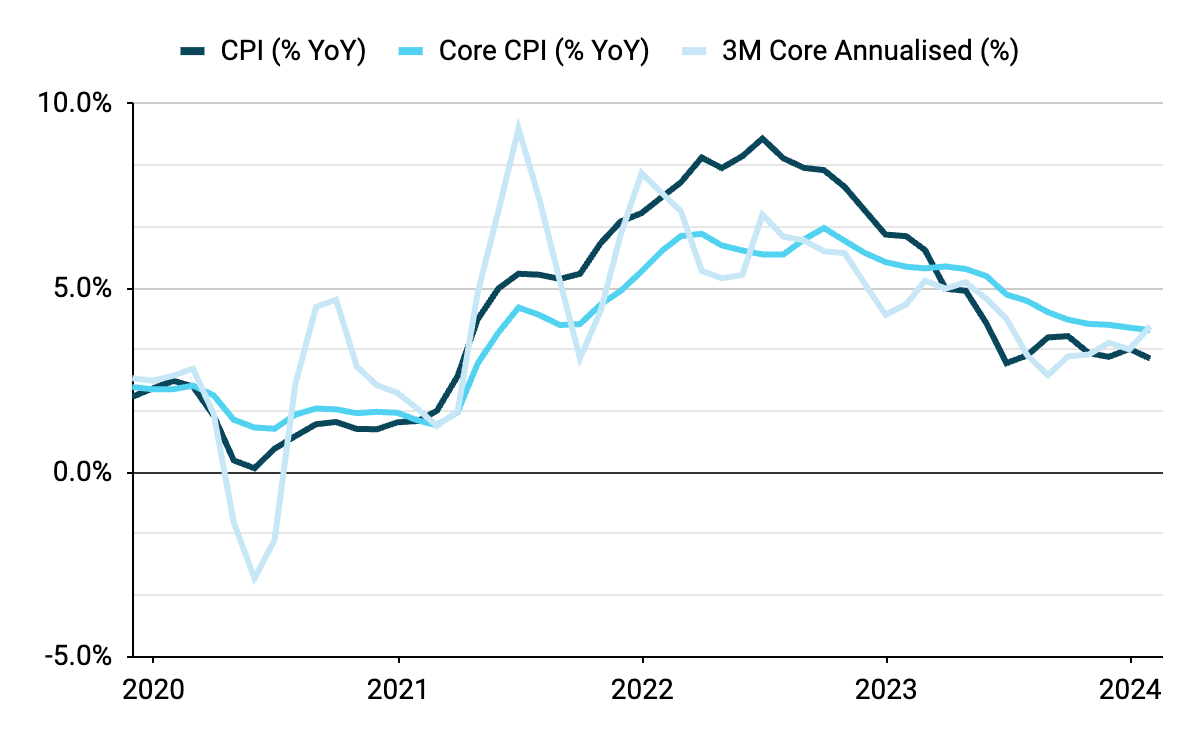 Když se podíváme do doby před několika týdny, zdá se těžko uvěřitelné, že trhy počítaly se snížením úrokových sazeb Fedu v březnu. Od té doby americká ekonomika opět zrychlila a inflace se odrazila ode dna. Náš oblíbený ukazatel inflace, tříměsíční anualizovaný průměr jádrového indexu spotřebitelských cen, je nyní pevně zpět nad 4 % a již více než šest měsíců má rostoucí trend.