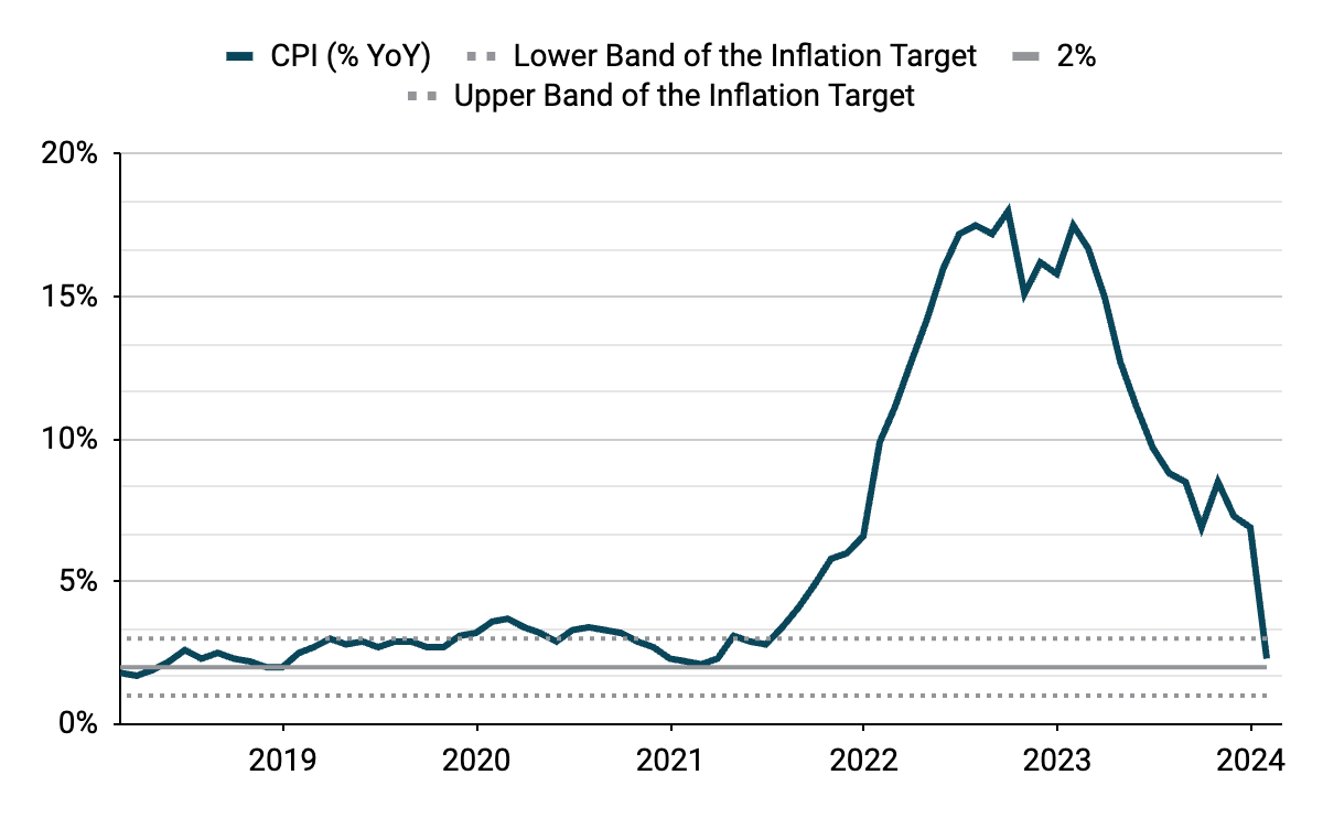 Česká koruna se minulý týden opět umístila na konci žebříčku středoevropských měn, když se vůči euru prodávala o 0,8 % níže. Koruna utrpěla dalším rozšířením tržních očekávání ohledně snižování sazeb mezi Českem a hlavními zeměmi, protože inflace v USA i v Česku překvapily. Celková míra inflace v Česku v lednu klesla z 6,9 % na 2,3 % a byla výrazně nižší než očekávaných 2,9 %. Poprvé od poloviny roku 2021 se tak nachází v rámci cíle centrální banky (2 % ± 1 %.). Jádrová inflace se rovněž zmírnila a v lednu dosáhla 2,9 %, což je její nejnižší úroveň od dubna 2020.