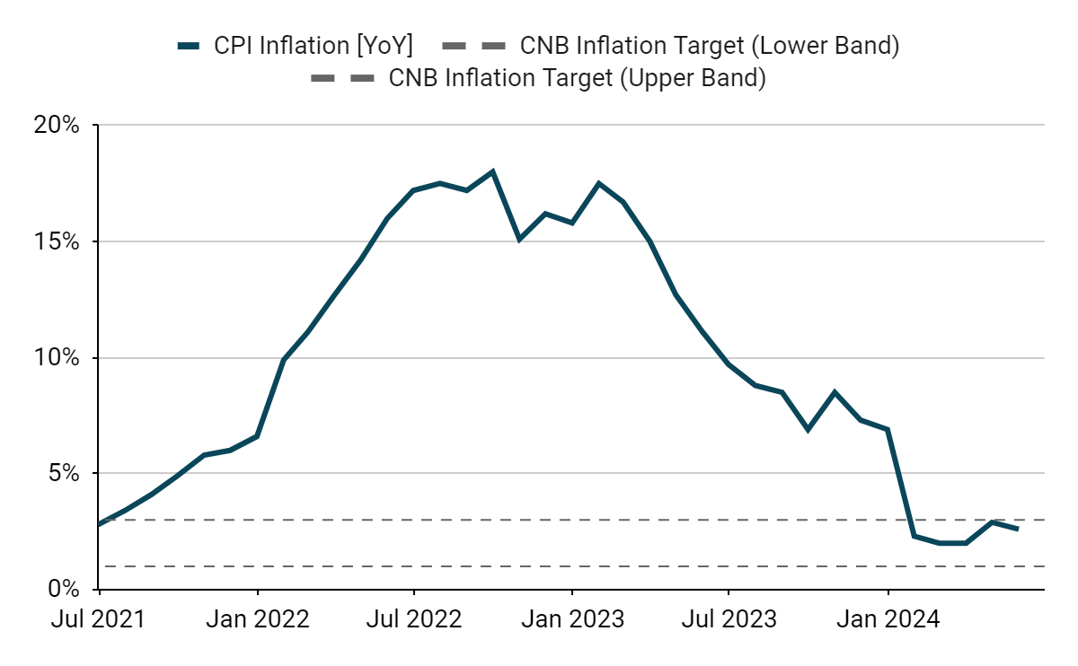 Graf 1: Míra inflace spotřebitelských cen v České republice (2021 – 2024)