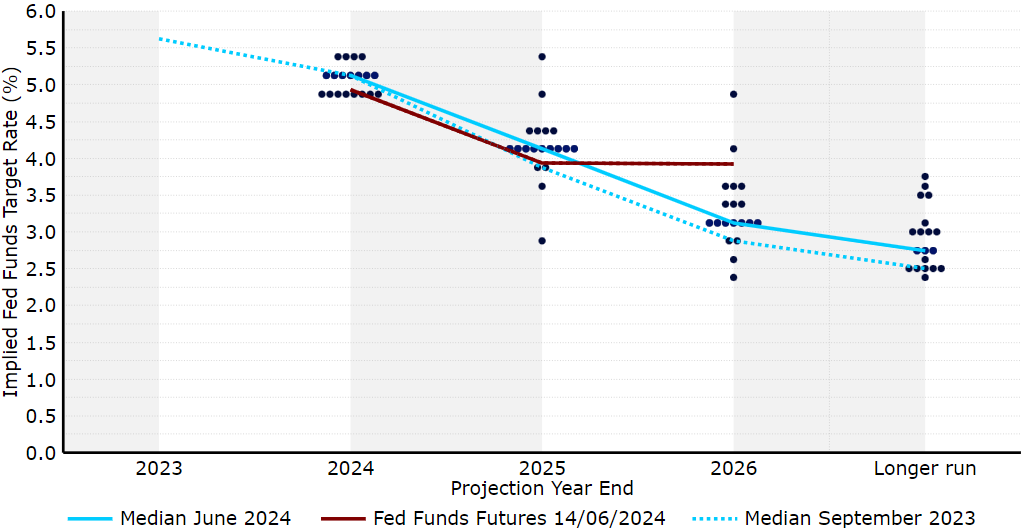 Velmi vítaná nízká inflace v USA za květen ve středu kontrastovala s relativně jestřábím oznámením Fedu jen o několik hodin později. „Dot plot“ naznačil, že většina představitelů FOMC nyní vidí prostor pro pouze jedno snížení do konce roku, což je nižší než původně plánovaná tři snížení (predikováno v březnu). To bylo poněkud jestřábí překvapení, zejména po údajích o květnové inflaci, jelikož většina trhu očekávala, že medián odhadů pro rok 2024 ukáže celkem dvojí snížení.