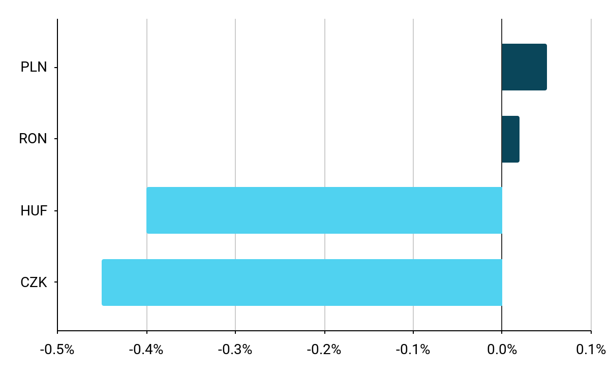Přestože se koruně dostalo určité podpory ze strany holubičího postoje Federálního rezervního systému, koruna zakončila týden vůči euru o 0,4 % slabší a byla nejméně výkonnou měnou střední a východní Evropy v minulém týdnu. Na domácím trhu se pozornost soustředila na mírně vyšší než očekávanou inflaci (7,3 %), která by však centrální bance neměla zabránit v uvolnění měnové politiky.