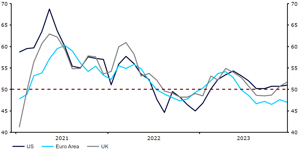 Graf 2: Indexy PMI zemí G3 (2021-2023)