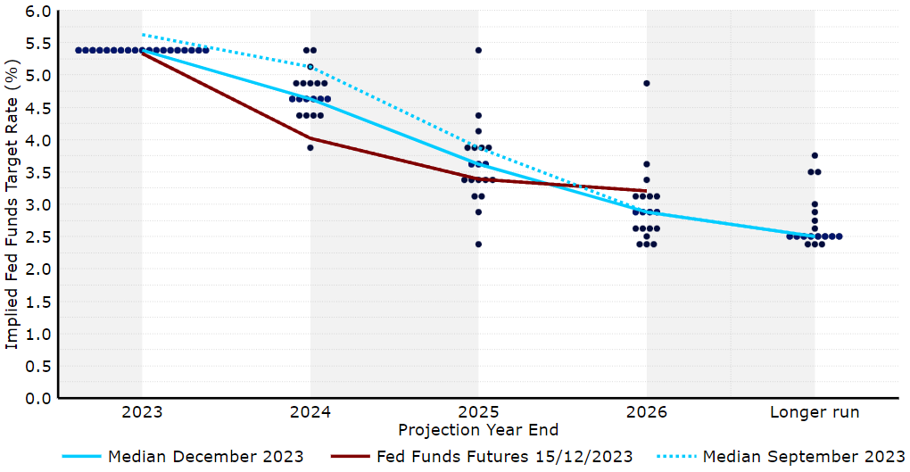 Graf 3: FOMC Dot Plot (prosinec 2023)